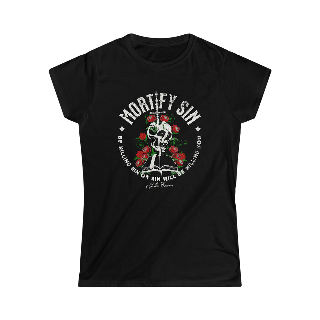 Mortify Sin - This women's soft-style tee is a more feminine version of the classic tee, with shortened sleeves that do not compromise modesty. Made from 100% ringspun cotton in all solid colors, it offers a perfect combination of comfort and durability. The shoulders are taped with twill to enhance their durability, and the collar seam is reinforced with ribbed knitting.