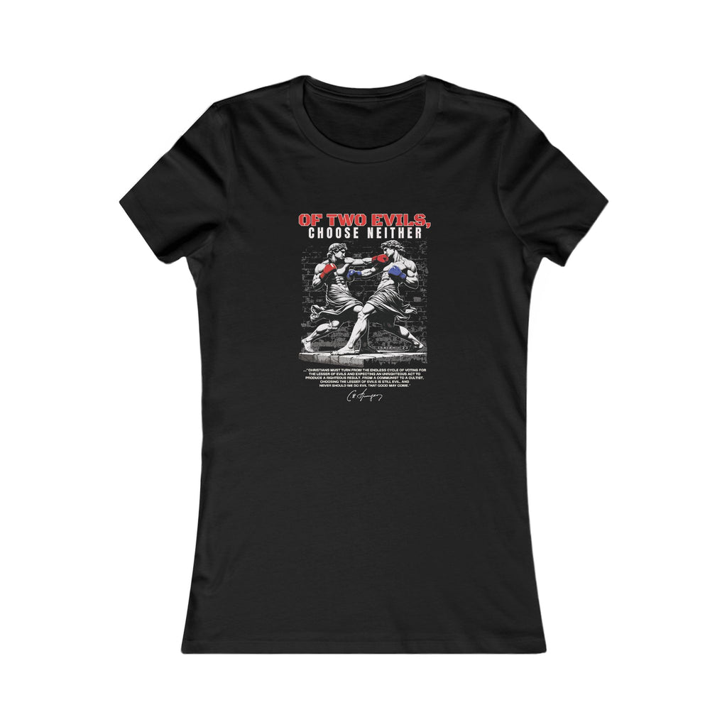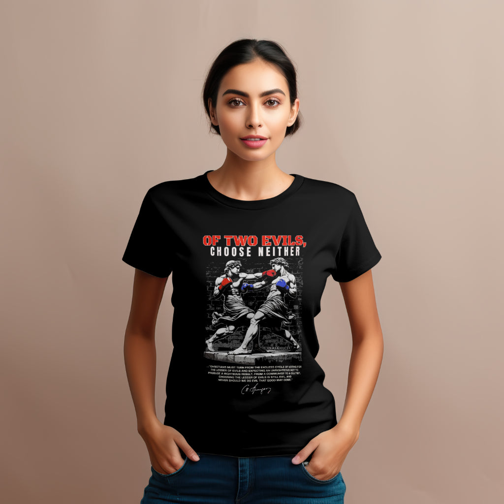 Of Two Evils Choose Neither - Women's Tee is a great choice for everyday wear. It's made from 100% Airlume combed and ring-spun cotton and has a light fabric that is perfect for hot summer days or layering under a sweater in the colder months. This tee has a comfortable feminine fit with a slim cut and a longer body length. The classic crewneck and short sleeves make it versatile and easy to style. Plus, it's made to feel like a well-loved favorite!