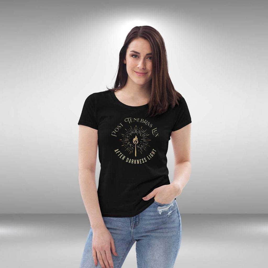Post Tenebras Lux - This women's tee is a more feminine version of the classic tee, with shortened sleeves that do not compromise modesty. Made from 100% ringspun cotton in all solid colors, it offers a perfect combination of comfort and durability. The shoulders are taped with twill to enhance their durability, and the collar seam is reinforced with ribbed knitting.