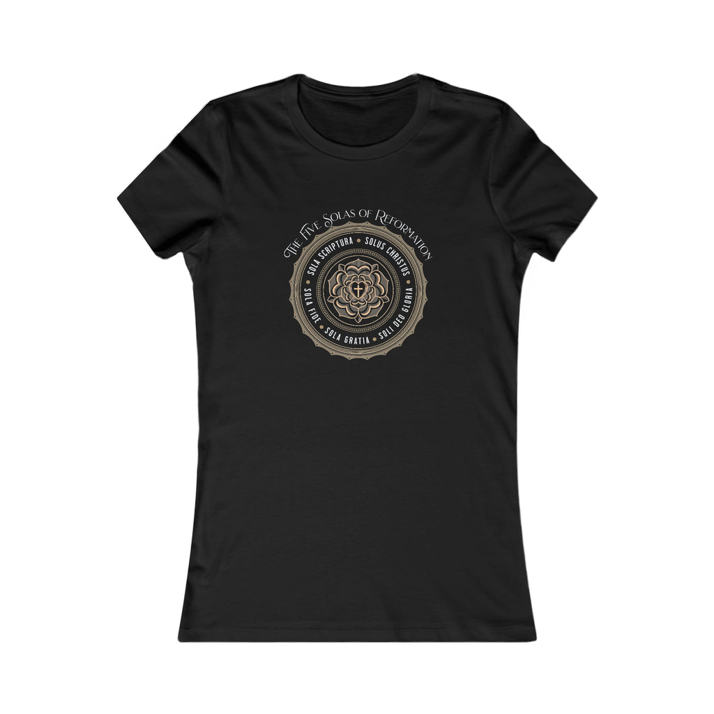 This 5 Solas of the Reformation Women's Tee is an excellent choice for everyday wear. It's made from 100% Airlume combed and ring-spun cotton and has a light fabric that is perfect for hot summer days or layering under a sweater in the colder months. This tee has a comfortable feminine fit with a slim cut and a longer body length. The classic crewneck and short sleeves make it versatile and easy to style. Plus, it's made to feel like a well-loved favorite!